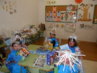 Este año el ciclo de E. Infantil nos decidimos por trabajar el tema del reciclado. Los niños y niñas de cuatro años nos tocó investigar sobre el papel y el cartón y lo necesario que es la reutilización de este material . Nos ha quedado claro que poniendo cada uno nuestro granito de arena cuidaremos de nuestro planeta. Con bolsas de basura azules del mismo color que los contenedores de papel a la que pegamos una gran variedad de objetos hechos de este material elaboramos nuestros disfraces y complementos. El viernes 17 por fin celebramos la fiesta. Las seños y el profe prepararon aperitivos , después nos disfrazamos y nos juntamos con los compañeros/as de las clases de tres y cinco años, Cantamos todos la chirigota que habíamos preparado.